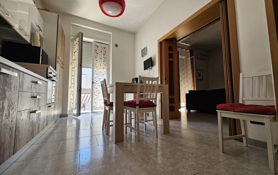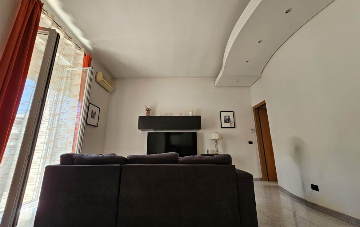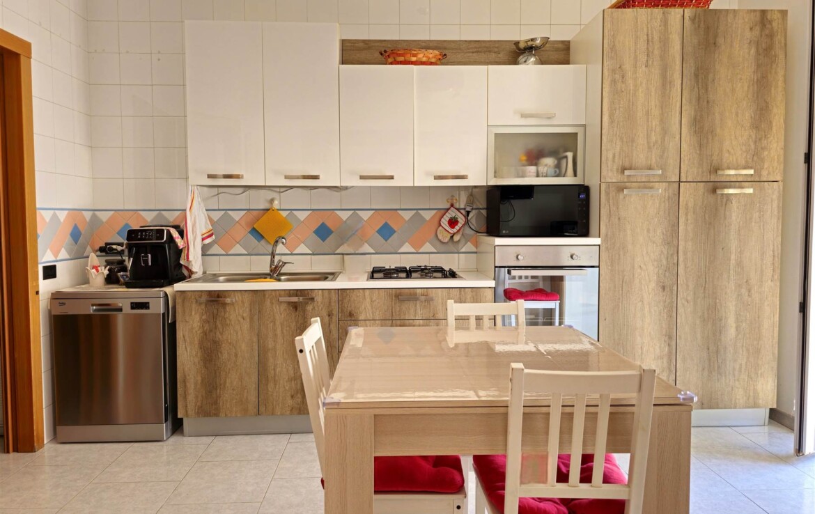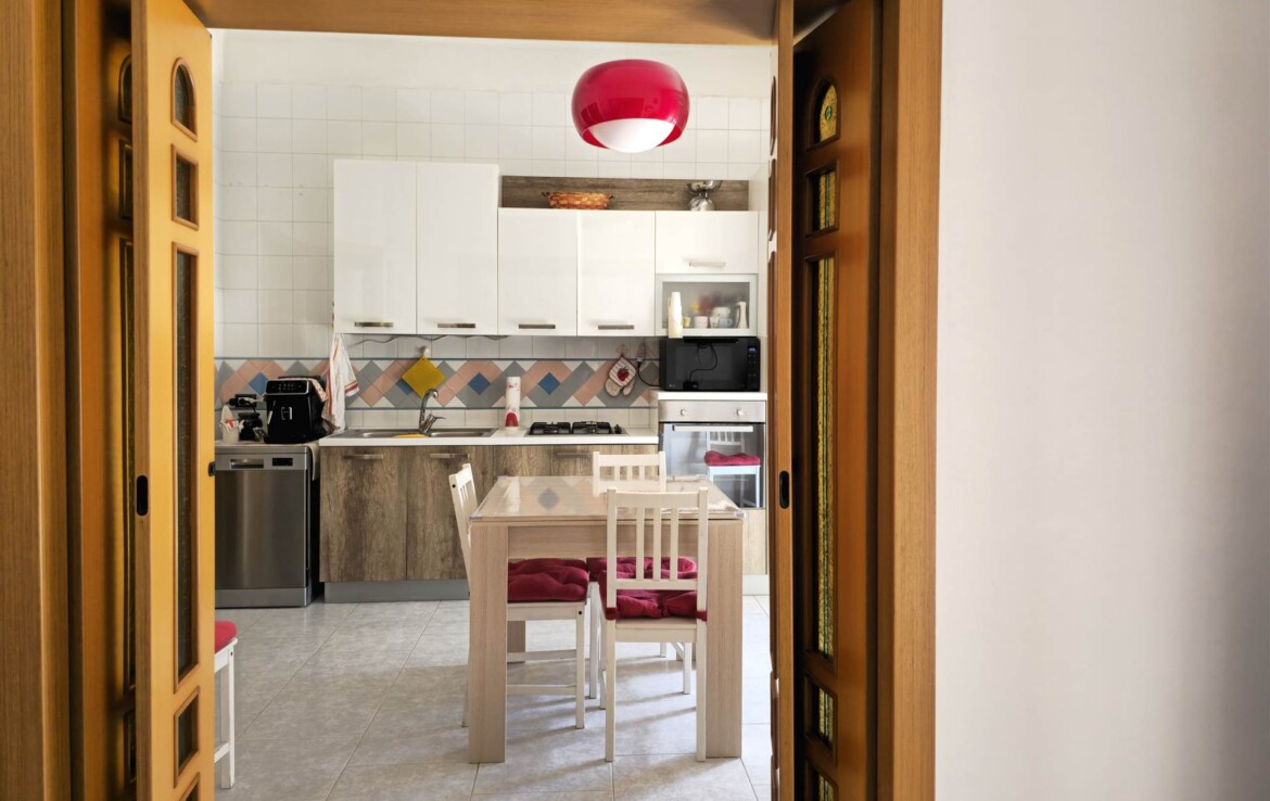 L’ingresso conduce a un comodo disimpegno, da cui si accede alla cucina abitabile, a un salottino confortevole, a un bagno di servizio, a una camera matrimoniale, una cameretta, un bagno padronale e un ripostiglio.