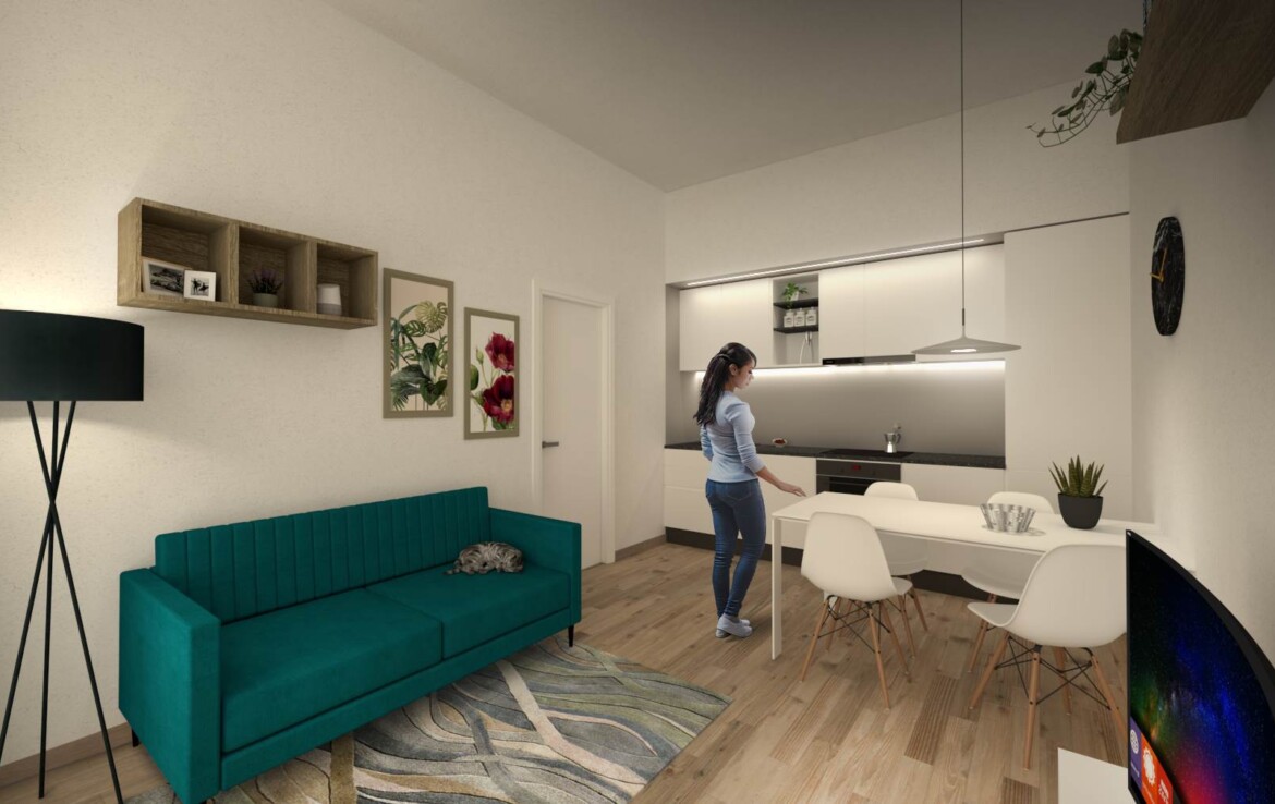 un ampio e luminoso ambiente living con cucina a vista, tre camere da letto, due bagni e un comodo ripostiglio, il tutto pensato per garantire praticità, comfort e una gestione ottimale degli spazi.